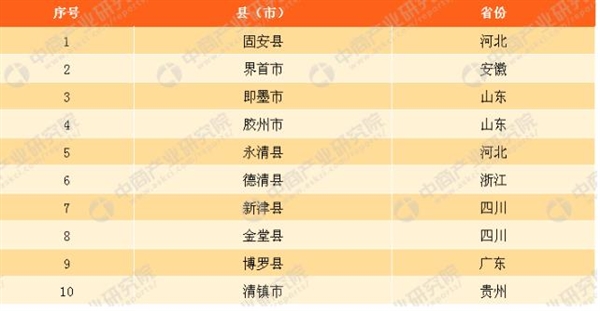 2017年全国投资潜力十强县(市):固安县、界首市、即墨市、胶州市、永清县、德清县、新津县、金堂县、博罗县和清镇市。