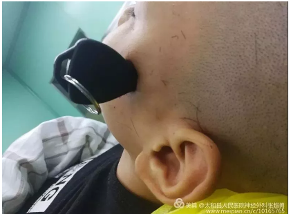 在手术中,见金属异物穿破颞骨,自颅底刺入脑内约0.5—1cm,自刺入处避开面神经延长切口长约5cm,咬除损伤处颞骨约1.5*2cm,完全游离金属异物后,予以拔除,仔细止血,反复消毒,颅底硬膜破口予以人工硬膜修复;手术最终顺利完成,刘小明也脱离了危险。